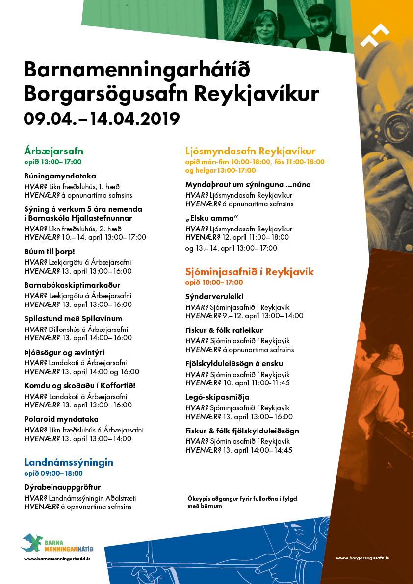 Í tilefni af Barnamenningarhátíð verður ókeypis aðgangur fyrir fullorðna í fylgd með börnum á öll söfn og sýningar Borgarsögusafns Reykjavíkur, dagana 9. - 14. apríl.